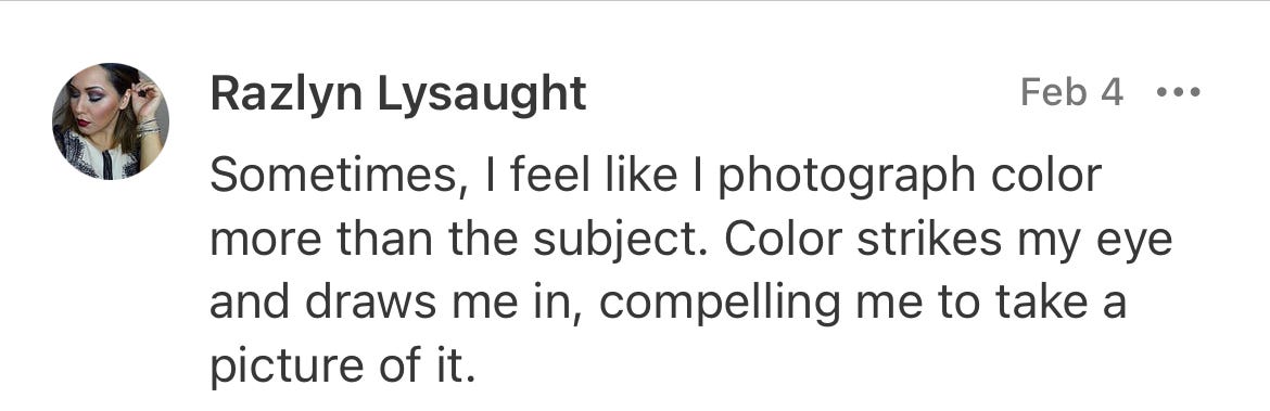 Color is an onion; there are many layers to it. So, instead of bombarding your senses all at once, color in photography will be one of those subjects I slowly unpack here on my Substack.